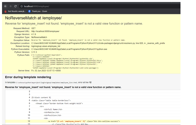 Check your project's URL configuration. Make sure that you have defined a URL pattern that corresponds to the name 'employee_insert'. This should be done in your project's urls.py file or in the app-level urls.py file if you're using app-specific URL configuration.