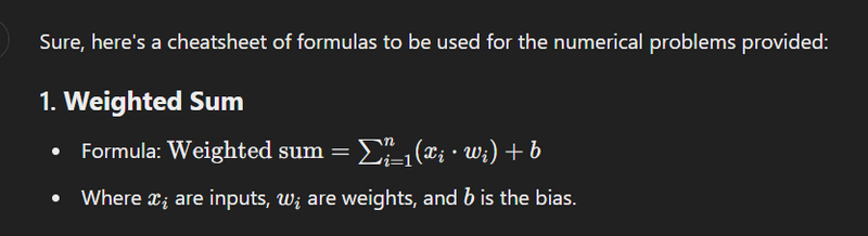 Solution: Weighted sum = (1.5 * 0.3) + (-2.0 * 0.8) + (-0.1) = 0.45 - 1.6 - 0.1 = -1.25