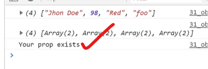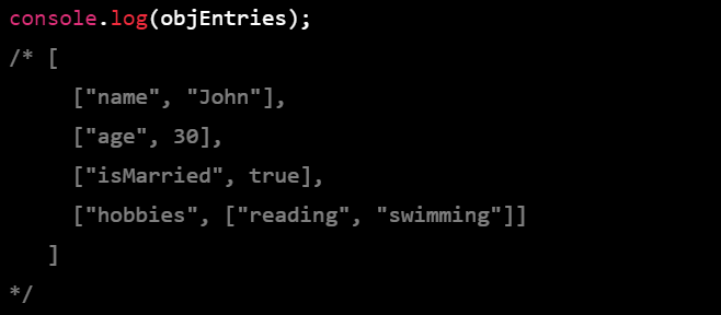 On the other hand, Object.entries() returns an array of arrays, each of which contains two elements: the key and the corresponding value. In our example, the key-value pairs are ["name", "John"], ["age", 30], ["isMarried", true], and ["hobbies", ["reading", "swimming"]].
