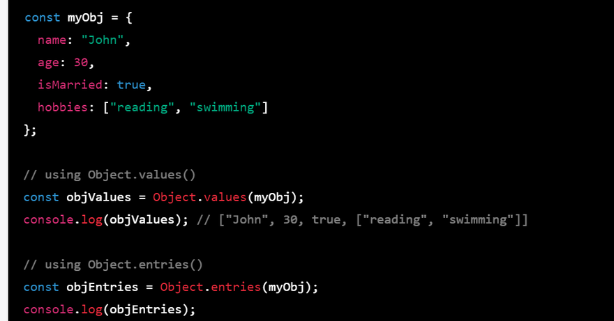 You can use these methods to iterate over the values or key-value pairs of an object, or to perform various operations on them.