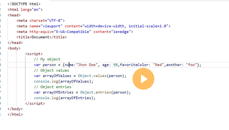 As you can see, Object.values() returns an array of the values in the object, in the order they were defined in the object. In our example, the values are "John", 30, true, and ["reading", "swimming"].