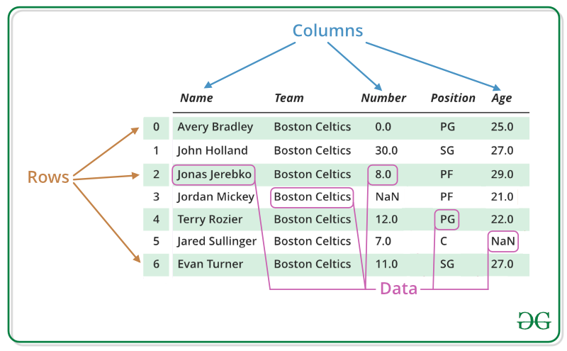 Pandas DataFrame is two-dimensional size-mutable, potentially heterogeneous tabular data structure with labeled axes (rows and columns). A Data frame is a two-dimensional data structure, i.e., data is aligned in a tabular fashion in rows and columns. Pandas DataFrame consists of three principal components, the data, rows, and columns.