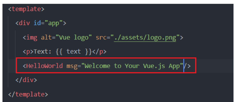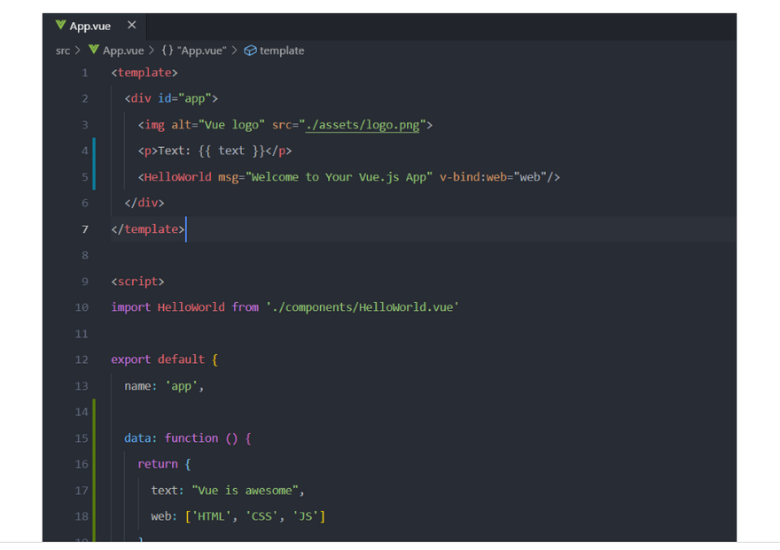 In the template, notice that we have already nested the HelloWorld component in the parent div, and that data is being passed to it from the app component. This is part of the default Vue landing page setup: