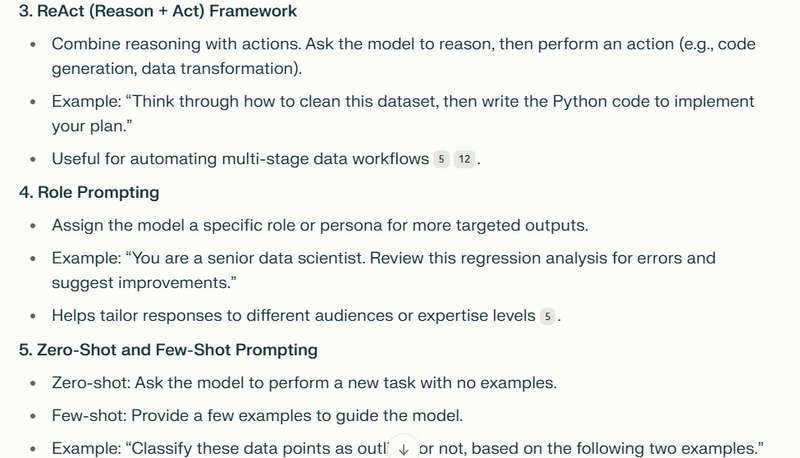 Break down complex tasks: Use multi-step prompts to guide the model through each stage of a complex analysis (e.g., “First, summarize the dataset. Second, identify missing values. Third, suggest imputation methods.”).