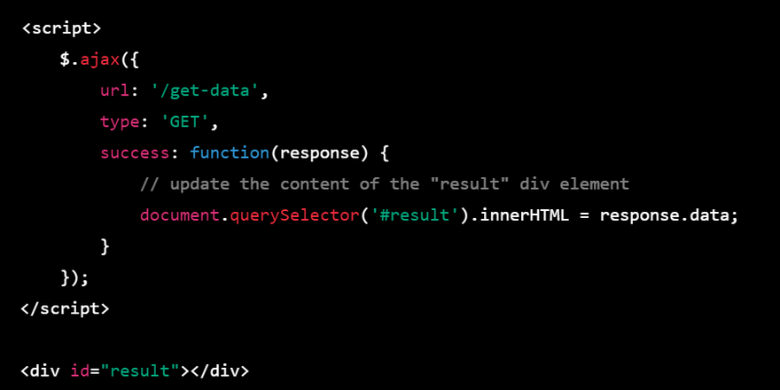 In the above code, the jQuery AJAX method is used to send a GET request to the "/get-data" URL. When the server responds with data, the success function is called, and the content of the "result" div element is updated with the data using the Query Selector method.