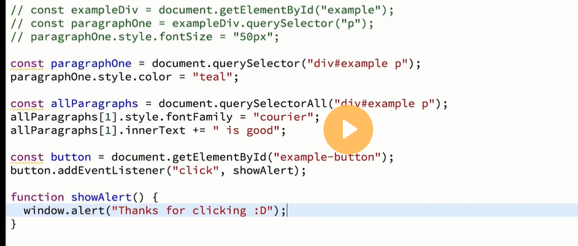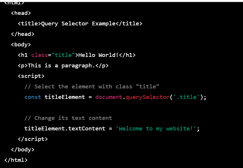 In this example, the querySelector method is used to select the h1 element with a class of "title". The selected element is then assigned to the titleElement variable. The textContent property of the titleElement is then changed to "Welcome to my website!", which updates the text content of the h1 element on the page.