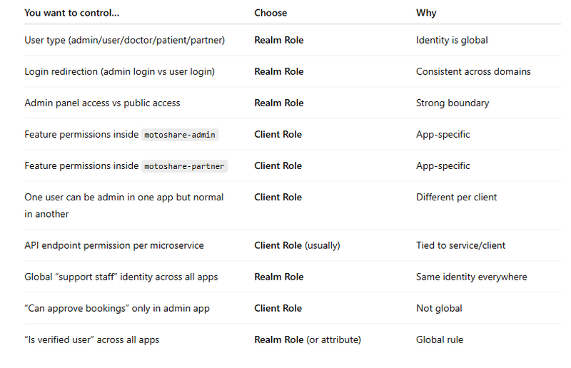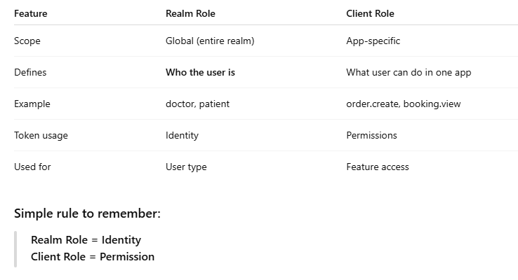 Realm Roles define the global identity of a user in Keycloak — such as doctor, patient, or partner — and remain consistent across all applications in the realm.