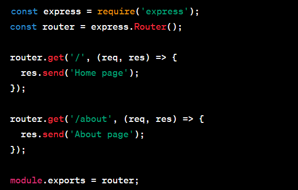 In this example, we define the routes in a separate module (routes.js), export the router instance, and then import and use it in the main application file (app.js).