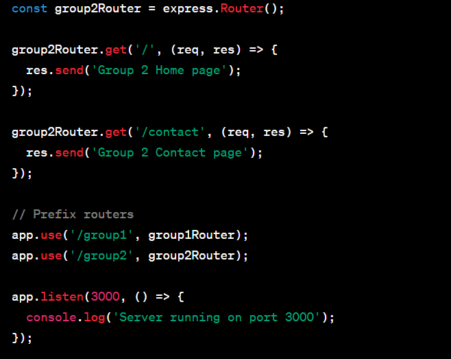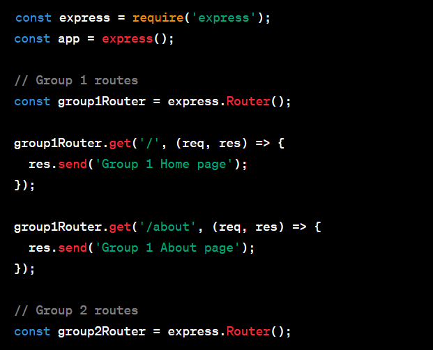 In this example, we create two separate routers: group1Router and group2Router. Each router handles a specific group of routes.