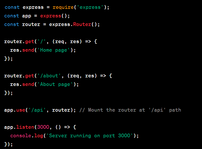 In this example, the router is mounted at the /api path, so all routes defined within the router will be prefixed with /api.