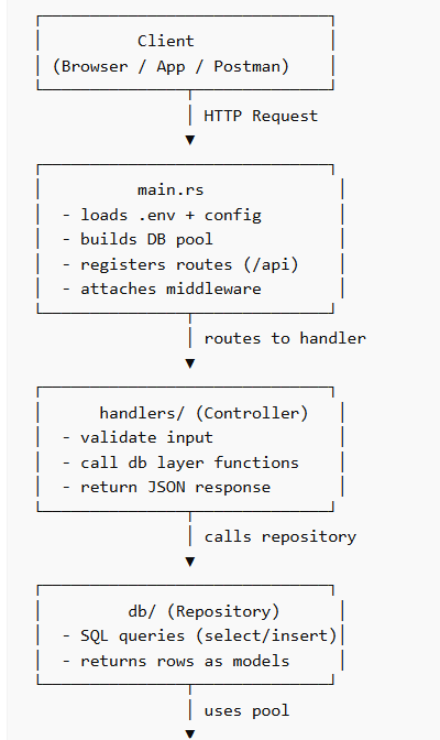 main.rs wires everything, handlers control requests, db executes SQL.