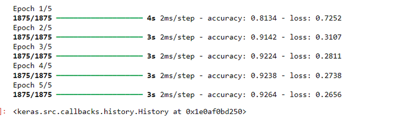 Model Training: The model is trained for 5 epochs on the training data (X_train_flattened) and the corresponding labels (y_train).