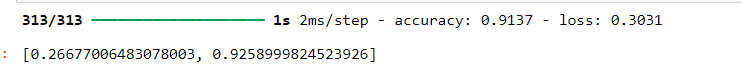 This indicates that the model has a loss of approximately 0.2667 and an accuracy of about 92.6% on the test dataset.