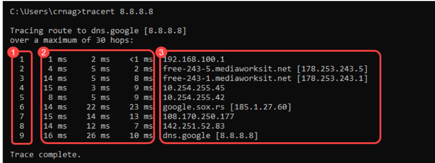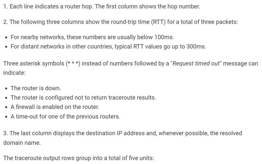 When running a traceroute, the output shows the path packets take when traveling to a destination point. The printed result divides into three general columns:
