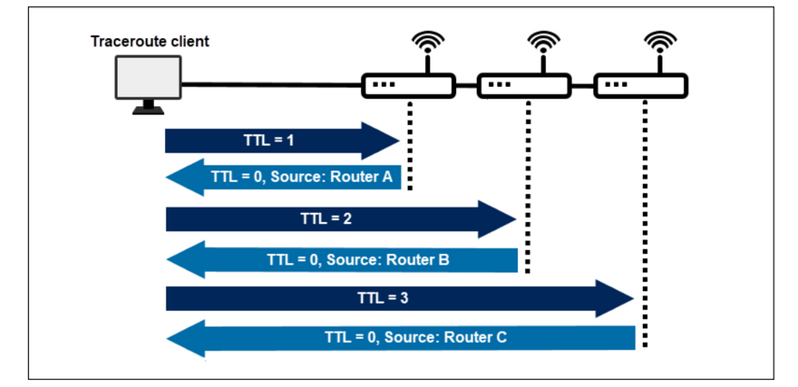 Identify Network Hops: traceroute identifies the network hops between the source and destination by sending a series of ICMP (Internet Control Message Protocol) packets with increasing Time-to-Live (TTL) values. The TTL value is gradually increased until the destination node is reached, and each hop along the way is identified and displayed in the output.