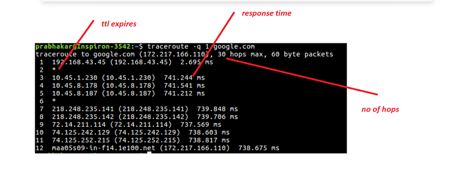However, if a router or a network node doesn't send back an "Time Exceeded" message within a certain time frame (usually 5 seconds), traceroute will mark that hop with an asterisk (). This could be because the **router is overloaded, misconfigured, or simply ignoring the ICMP messages*. In such cases, the traceroute program cannot determine the exact latency and network path to that node, and hence marks it with an asterisk.