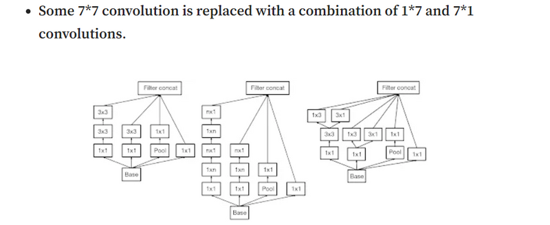This architecture also converts nXn factorization into 1xn and nx1 factorization. As we discussed above that a 3×3 convolution can be converted into 1×3 then followed by 3×1 convolution which is 33% cheaper in terms of computational complexity as compared to 3×3.