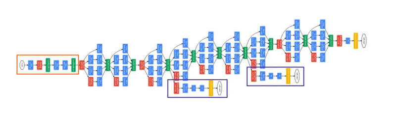 Using the dimension reduced inception module, a neural network architecture was built. This was popularly known as GoogLeNet (Inception v1). The architecture is shown below: