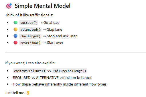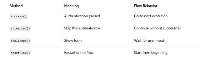Marks the current authenticator as successfully completed and moves to the next execution in the flow.