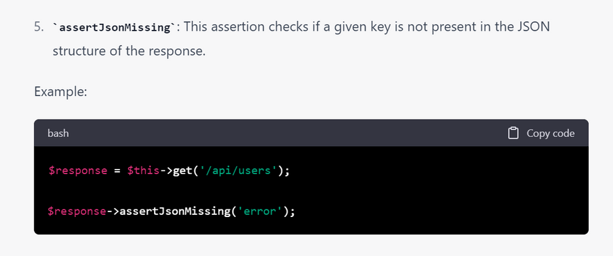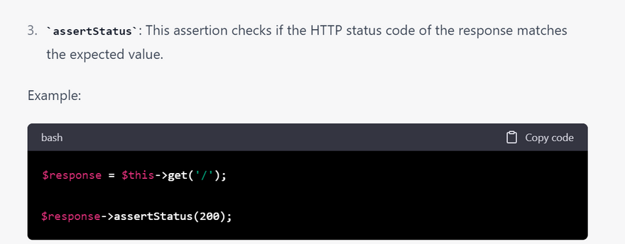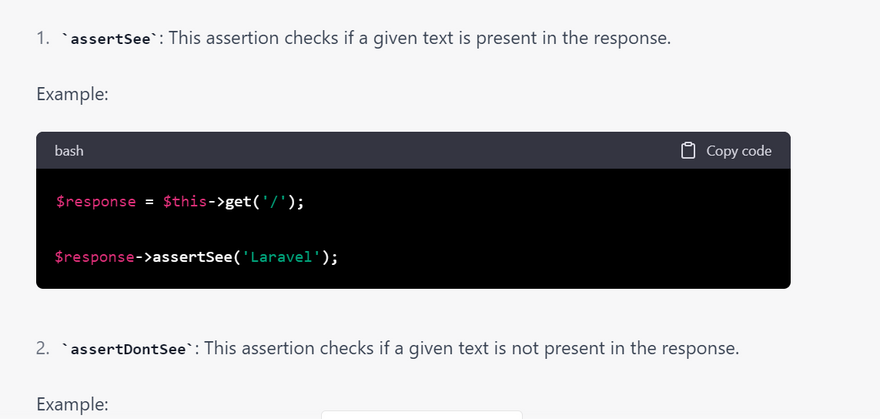 In Laravel, assertions are used to verify the expected outcome of code. Some common assertions in Laravel are: