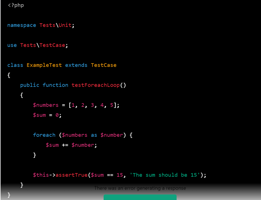 In this example, the testForeachLoop method loops over an array of numbers [1, 2, 3, 4, 5] and adds each number to a $sum variable. After the foreach loop has completed, it uses the assertTrue method to check that the $sum variable is equal to 15. If the $sum variable is not equal to 15, the test will fail and the message "The sum should be 15" will be displayed.