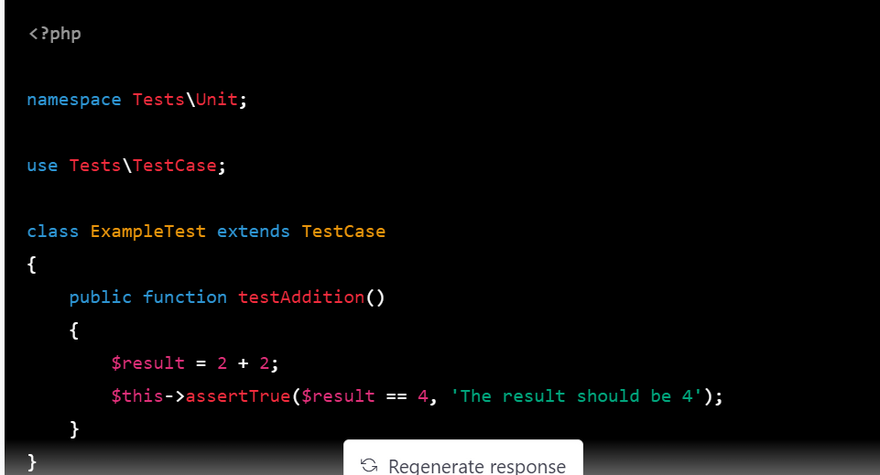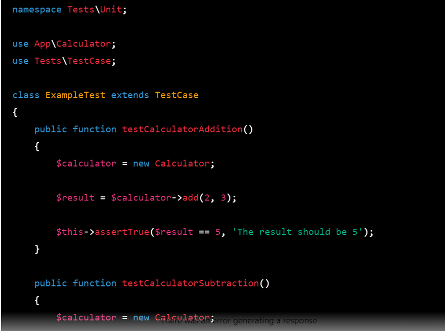 In this example, the testAddition method performs the addition of 2 + 2 and stores the result in the $result variable. Then, it uses the assertTrue method to check that the result is equal to 4. If the result is not equal to 4, the test will fail and the message "The result should be 4" will be displayed.