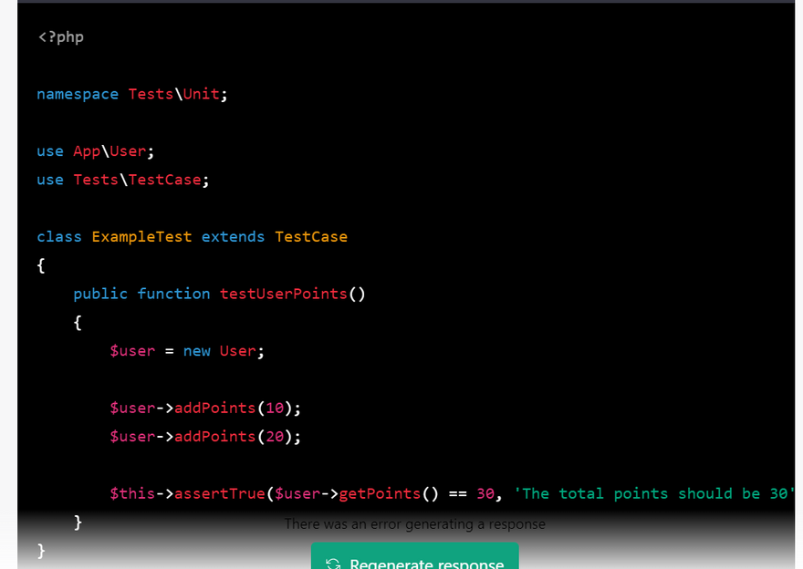 In this example, the testUserPoints method creates a new user object. It then adds 10 points and 20 points to the user using the addPoints method. Finally, it uses the assertTrue method to check that the getPoints method returns 30, which is the expected total points for the user. If the getPoints method does not return 30, the test will fail and the message "The total points should be 30" will be displayed.