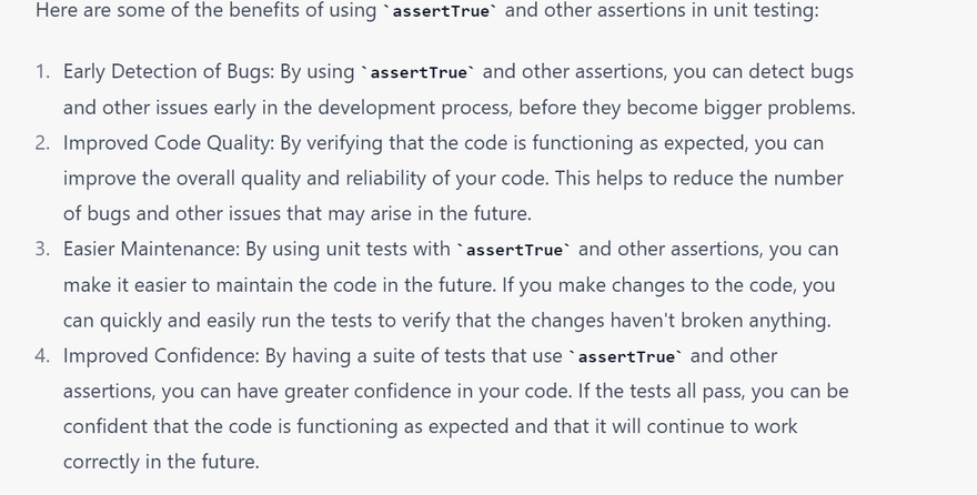 By using assertTrue in your unit tests, you can ensure that the code is functioning as expected and that the results are what you expect. This helps to catch any bugs or issues early in the development cycle, making it easier to fix them before they cause bigger problems in the future. Additionally, using assertTrue and other assertions can help to improve the overall quality and reliability of your code, by verifying that it behaves as expected under different conditions.