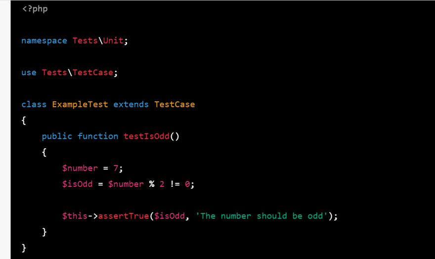 In this example, the testIsOdd method checks if the number 7 is odd. It stores the result in the $isOdd variable. Finally, it uses the assertTrue method to check that the $isOdd variable is true. If the $isOdd variable is not true, the test will fail and the message "The number should be odd" will be displayed.