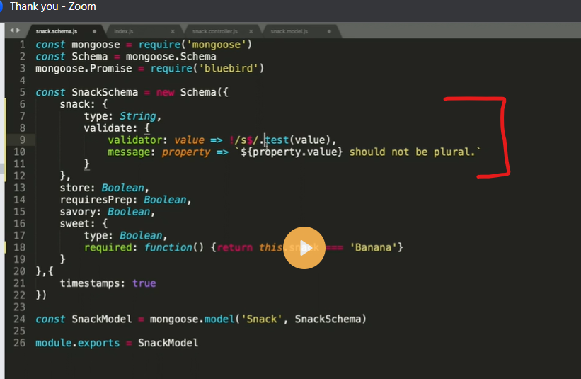 With this setup, when a request is made to create a new user, the custom validator defined in the model will be triggered. If the validation fails, the error will be caught in the controller, and an appropriate response will be sent to the client.