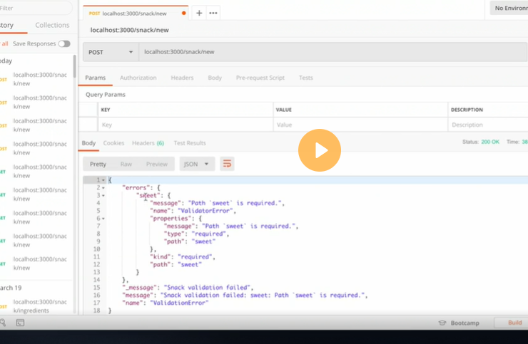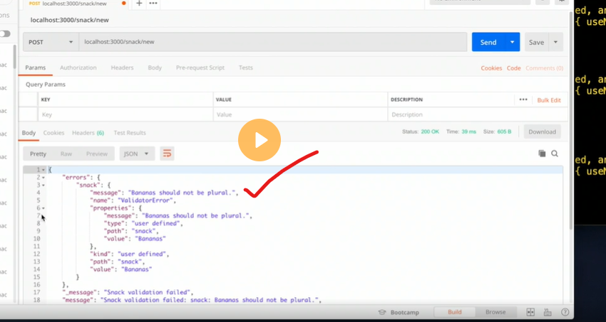 In the example, we're using the try-catch block to handle potential errors thrown by Mongoose. If a validation error occurs, the ValidationError name property can be used to identify it. In this case, we respond with a 400 status code and send the error message as a response.