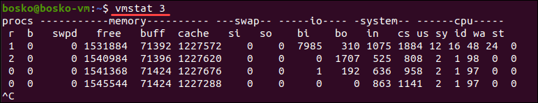 Note: A low delay value burdens the system because it runs the command infinitely until you stop it manually with the Ctrl+C key combo. To avoid the extra load, use a count value along with a delay value. The syntax is vmstat [delay[count]], and it is explained in detail in the following section.