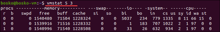 The vmstat command (short for virtual memory statistics) is a built-in monitoring utility in Linux. Users can observe system activity virtually in real-time by specifying a sampling period. The command helps you identify performance bottlenecks and diagnose problems in your system. The command is used to obtain information about following