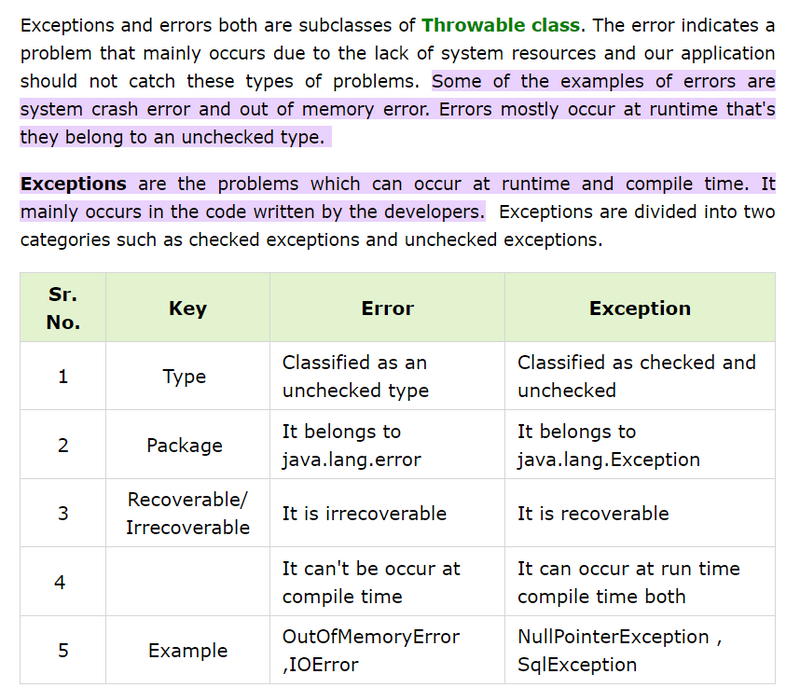 Errors are usually caused by serious problems that are outside the control of the program, such as running out of memory or a system crash. Errors are represented by the Error class and its subclasses. Some common examples of errors in Java include: