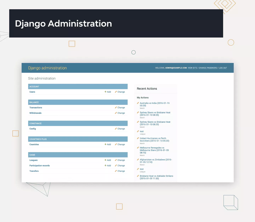Django has its own naming system for all functions and components (e.g., HTTP responses are called “views”). It also has an admin panel, which is deemed easier to work with than in Lavarel or Yii, and other technical Django features, including: