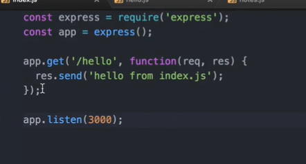 In this example, we require the express module and create an instance of the express application. We define a route for the root path (/) using the app.get() method, which sends the string 'Hello, World!' as the response to the client. Finally, we start the server using the app.listen() method, which listens for HTTP requests on port 3000 and logs a message to the console when the server starts.