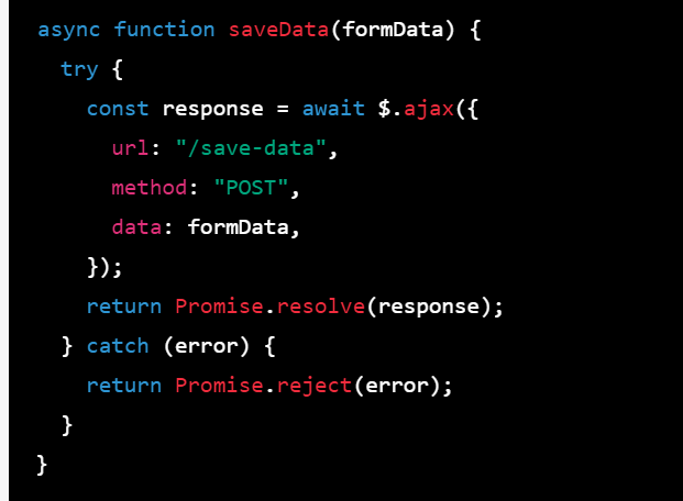 Step 2: Use the async keyword to define an asynchronous function that sends a request to the server to save the data. Inside this function, use the await keyword to wait for the response from the server. If the response is successful, return the response data wrapped in a resolved promise. If there is an error, throw an error wrapped in a rejected promise.
