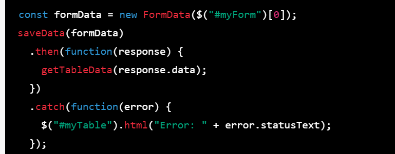 Step 3: Call the saveData function and use the then method to handle the response from the server. If the server returns a success message, call a function to get the JSON objects data and display it in the table element using the html method of jQuery. If there is an error, display the error message in the table element.
