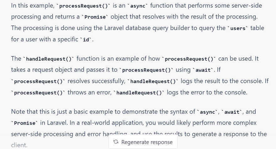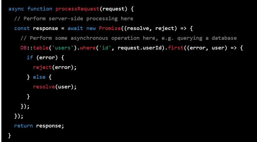 In this example, processRequest() is an async function that performs some server-side processing and returns a Promise object that resolves with the result of the processing. The processing is done using the Laravel database query builder to query the users table for a user with a specific id.