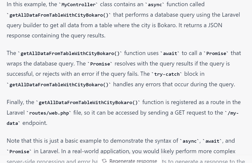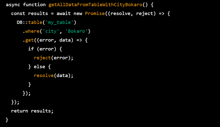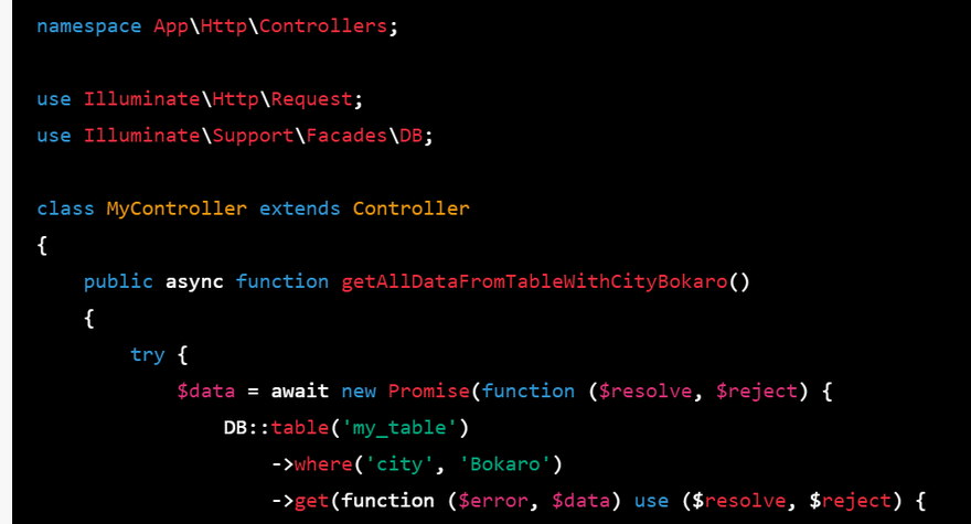 In this example, getAllDataFromTableWithCityBokaro() is an async function that performs a database query using the Laravel query builder to get all data from a table where the city is Bokaro. It returns a Promise object that resolves with the query results.