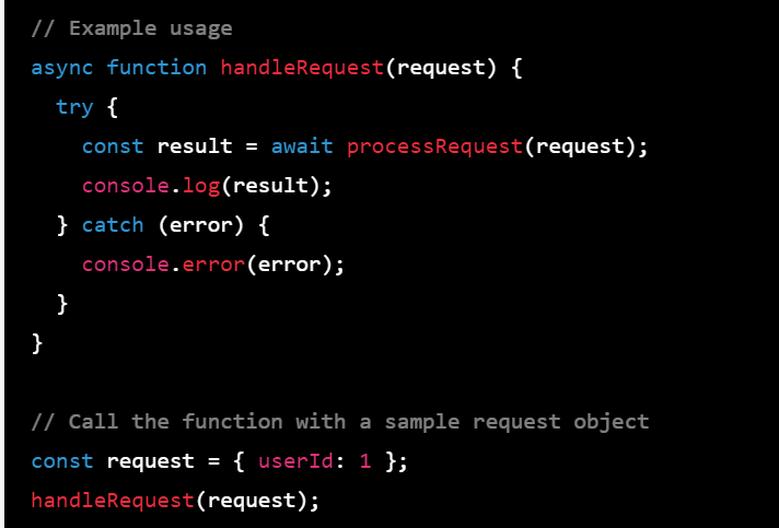The handleRequest() function is an example of how processRequest() can be used. It takes a request object and passes it to processRequest() using await. If processRequest() resolves successfully, handleRequest() logs the result to the console. If processRequest() throws an error, handleRequest() logs the error to the console.