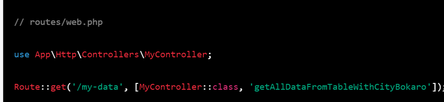 Route::get('/my-data', [MyController::class, 'getAllDataFromTableWithCityBokaro']);