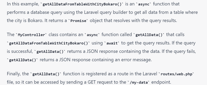 Finally, the getAllData() function is registered as a route in the Laravel routes/web.php file, so it can be accessed by sending a GET request to the /my-data endpoint.