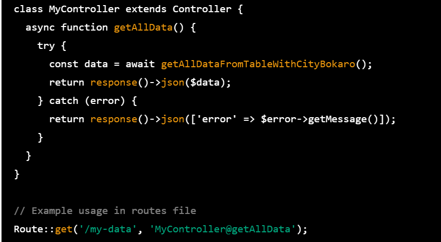 In this example, the MyController class contains an async function called getAllDataFromTableWithCityBokaro() that performs a database query using the Laravel query builder to get all data from a table where the city is Bokaro. It returns a JSON response containing the query results.