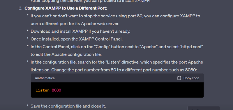 Now, Apache in XAMPP should be running on the new port (8080 in this example), and you should be able to access your web applications using that port (e.g., http://localhost:8080). This allows you to have both XAMPP and the other service coexist without conflicts on port 80.