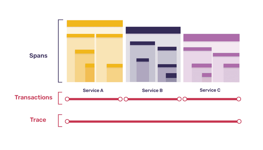 Trace: A trace captures the detailed path and timing of a specific transaction as it traverses through various components and services. For instance, in our e-commerce application, a trace for the purchase transaction would include information about the time taken at each step, such as the search request, retrieval of product details, adding to the cart, processing payment, and generating the order confirmation. The trace provides a comprehensive view of the transaction's lifecycle, including any delays or performance issues encountered along the way.