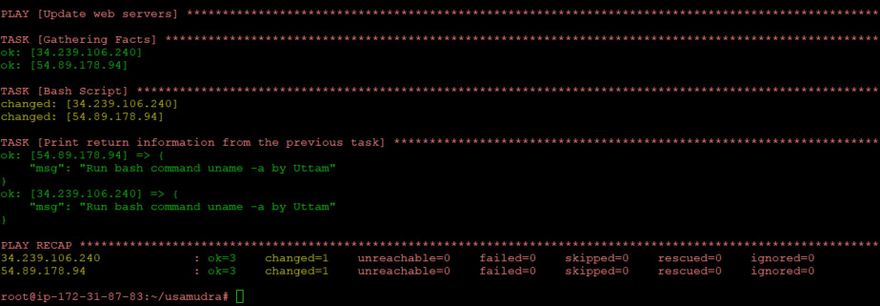 - name: Print return information from the previous task ansible.builtin.debug: msg: "Run bash command uname -a by Uttam"
